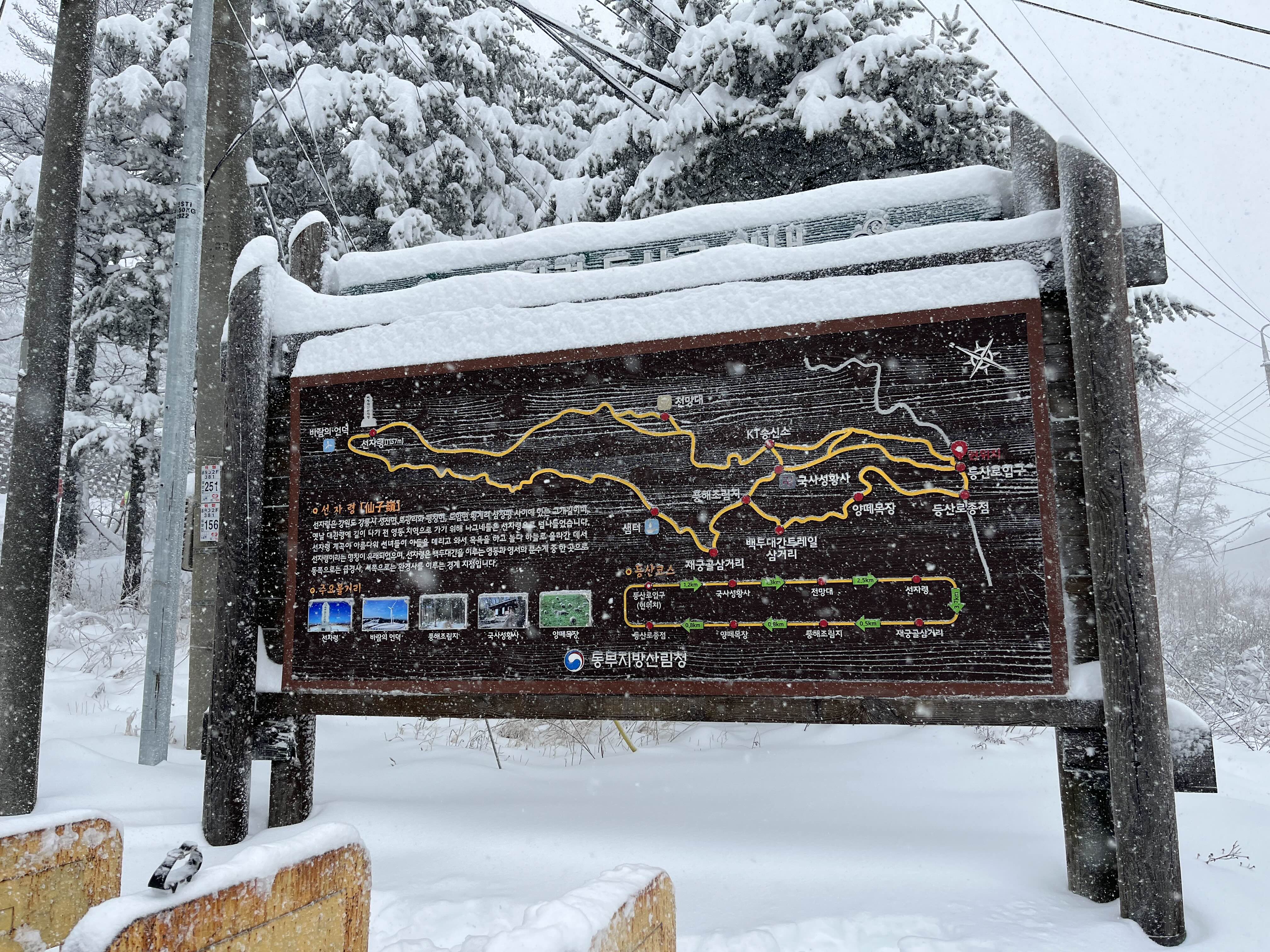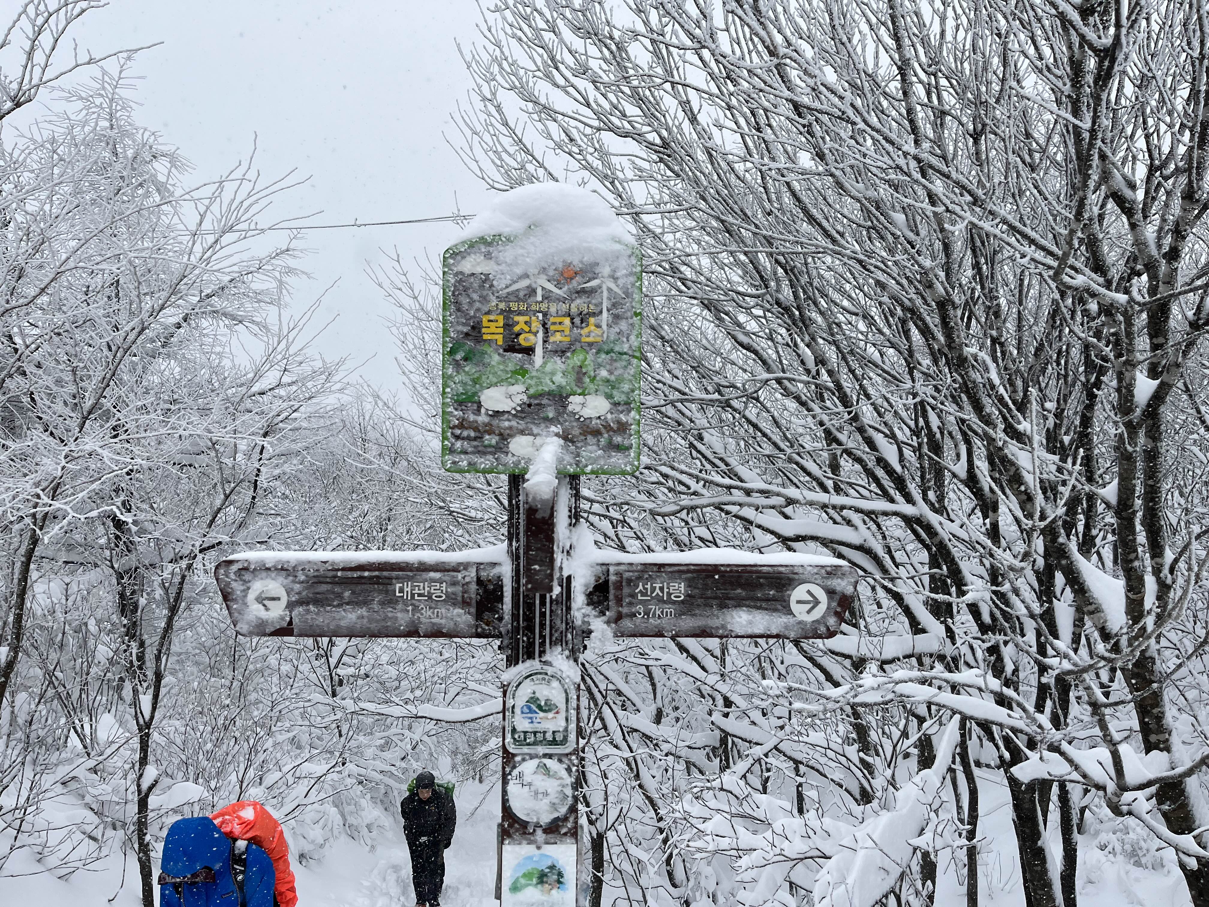 너무 아름다웠는데, 표현할 수 있는 형용사가 없다... 이 숲길을 지났다면 거의 다 하산한 것이다. 눈이 와서 좋았던 점은 길을 잃을 걱정이 없었다는 것..? 적설량이 많았어서 사람들이 하산한 길이 너무 뚜렷하게 보였다.