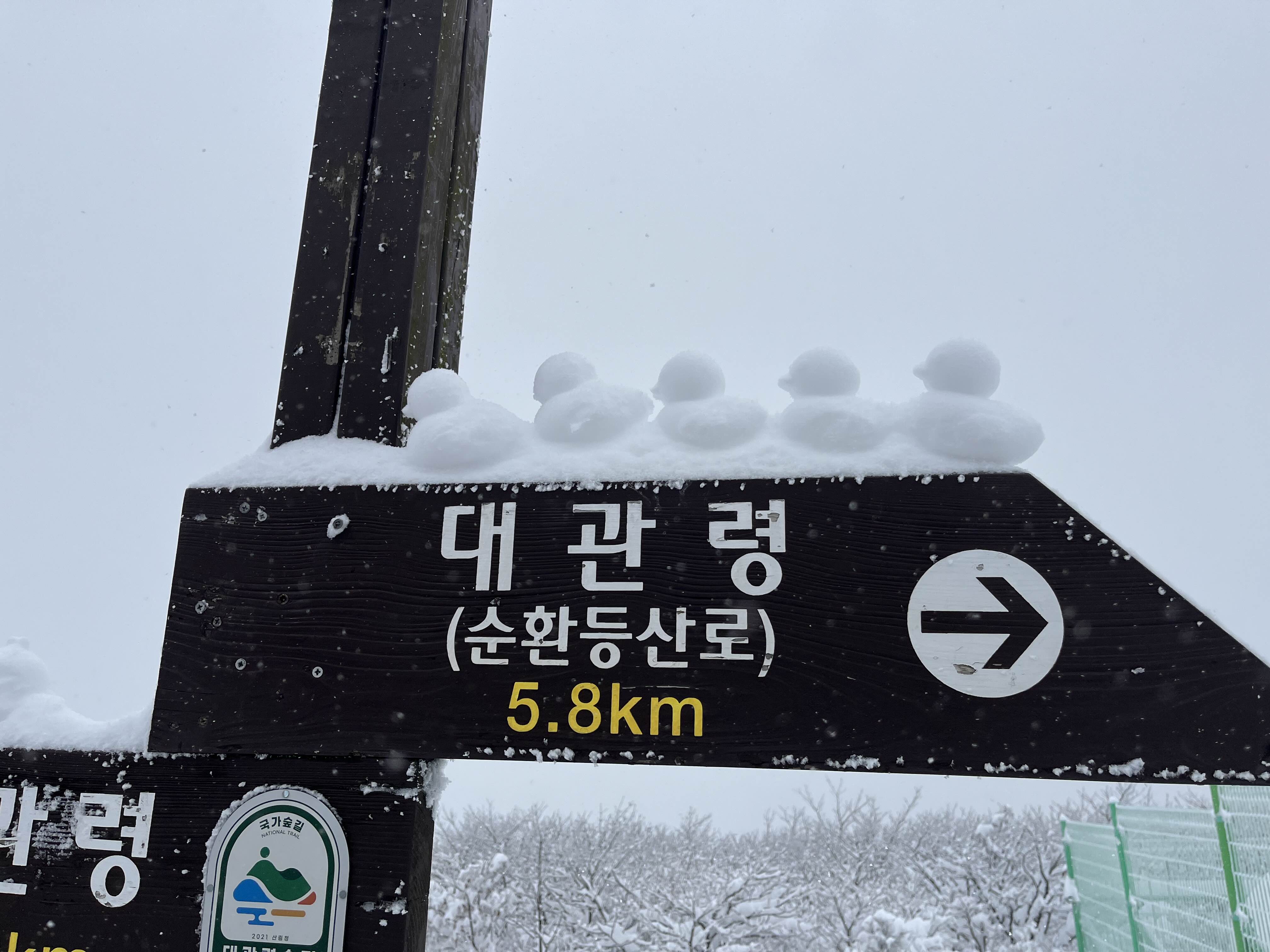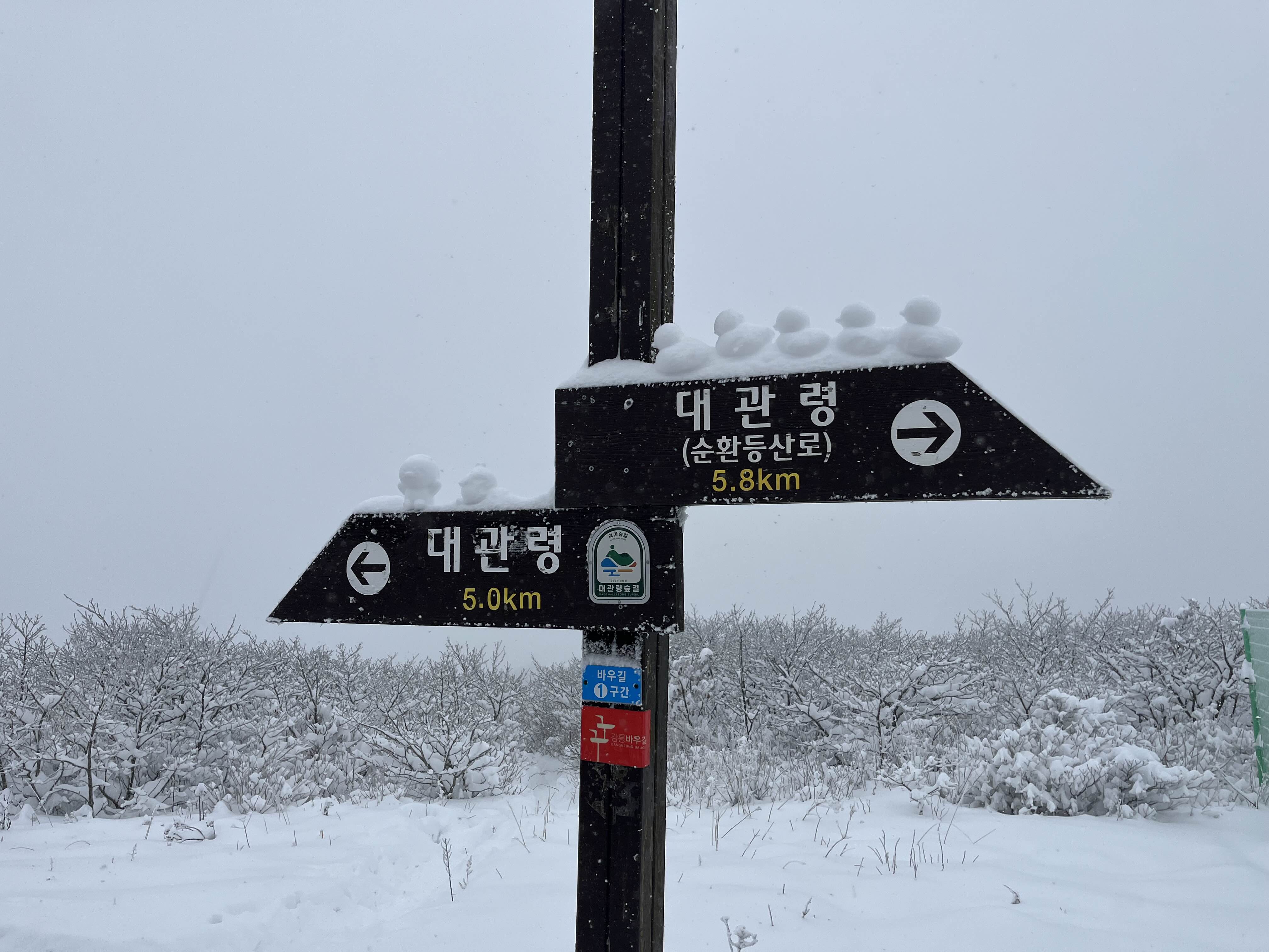 정상에서 내려갈 때는 무조건 아이젠 필수다. 우리도 정상에서 사진 찍고 바로 아이젠을 끼고 내려갔다. 눈이 미끄럽지 않은 눈이더라도, 하산 때 부상이 많이 발생하기도 하고 경사져서 미끄러울 수밖에 없기 때문에 아이젠을 꼭 착용해야한다. 내려갈 때는 대관령 양떼목장쪽으로 내려가면 된다. 올라왔던 길로 다시 가도 회귀할 수 있지만, 우리는 순환등산로를 이용해 양떼목장으로 회귀하는 코스로 하산했다.